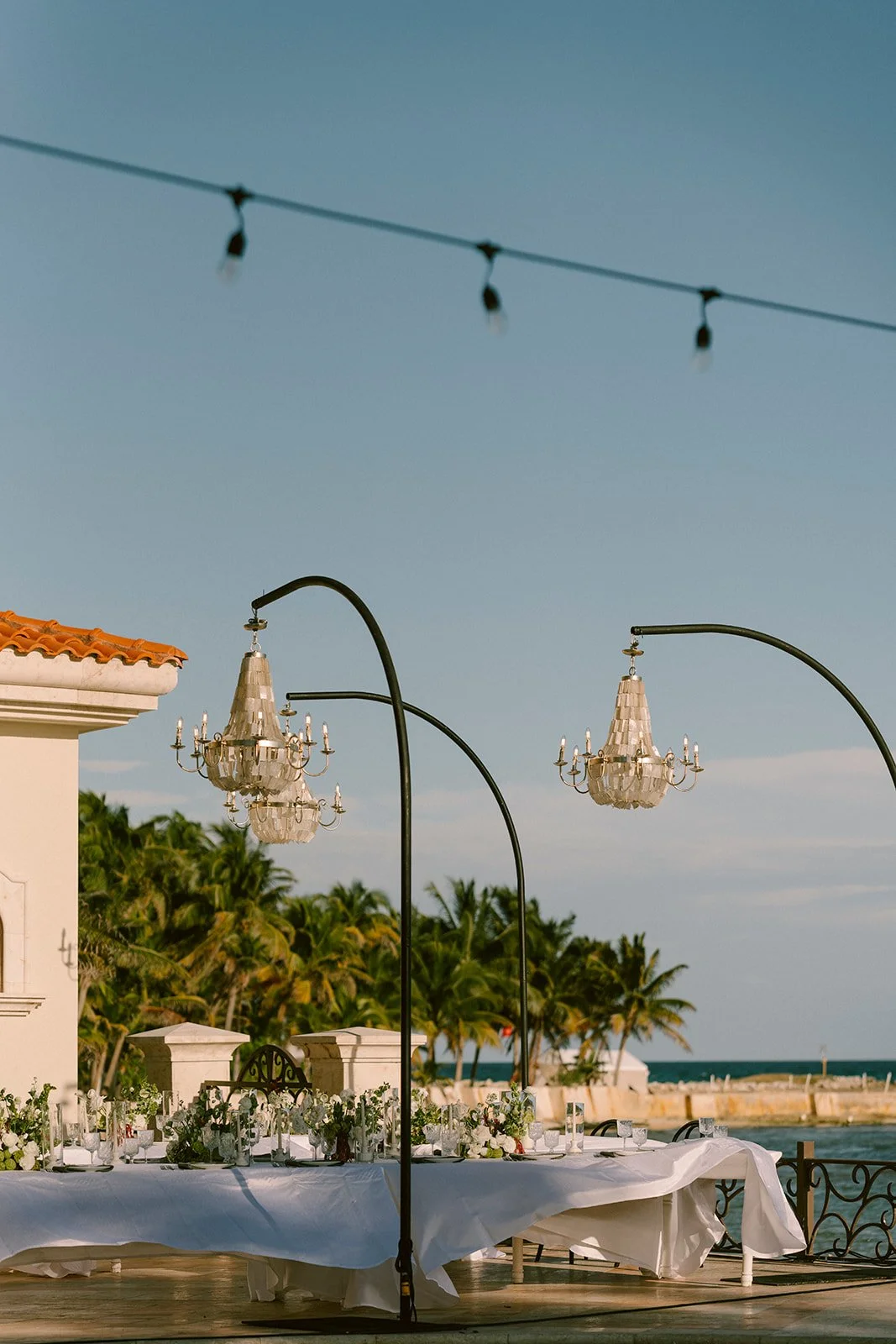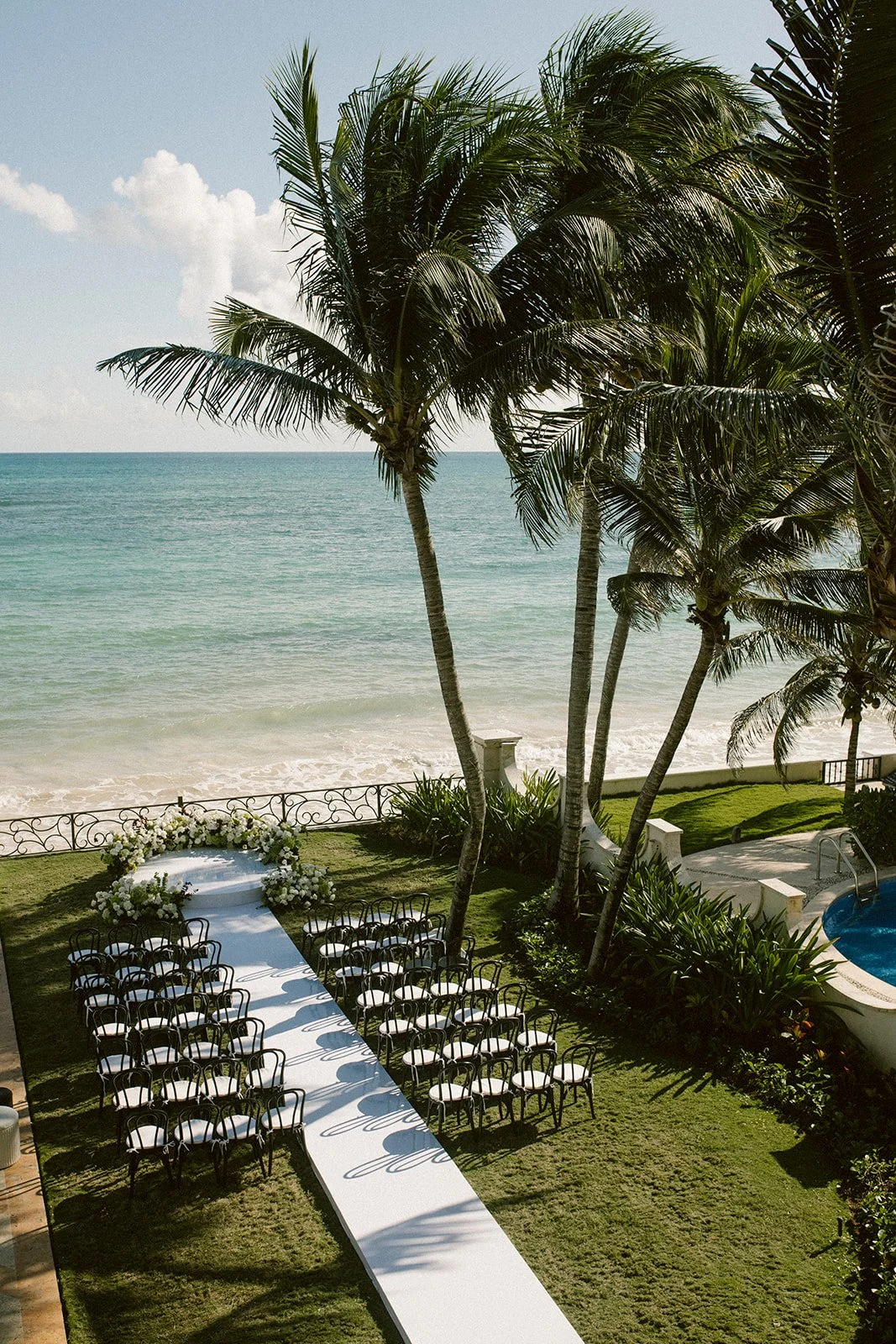 Following the ceremony, guests gathered on the terrace overlooking the Caribbean Sea for a reception set beside the pool.