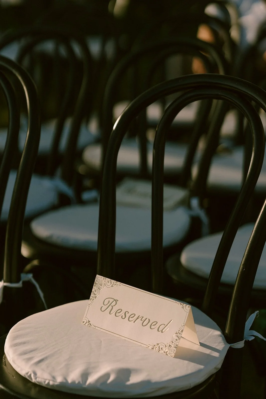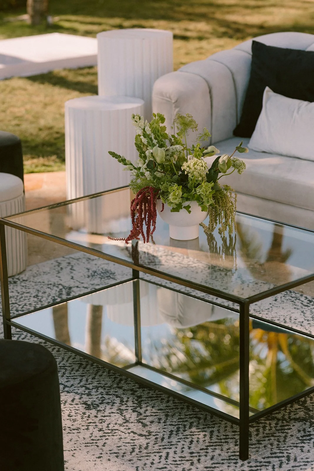 Organic floral arrangements added movement and texture, while soft linens and layered fabrics kept the look cohesive. The black accents, from ceremony chairs to table details, added contrast and gave the design a subtle edge.