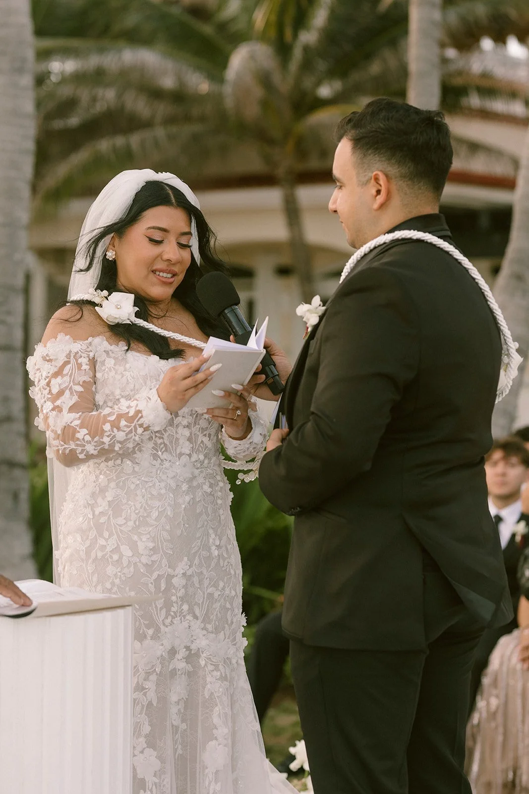 As Amanda and Tanner stood together exchanging vows, framed by the villa’s arches and florals, the ceremony felt grounded, personal, and beautifully composed.