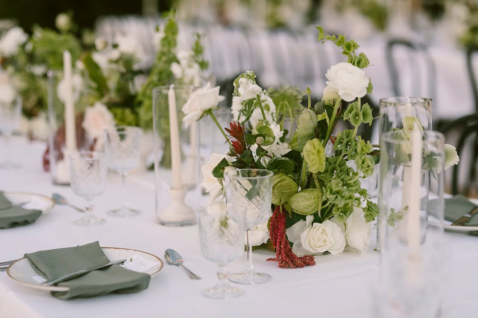 Long banquet tables created a shared, welcoming layout that encouraged conversation and connection. Neutral linens, flowing textures, and lush floral centerpieces carried the ceremony’s aesthetic into the evening.