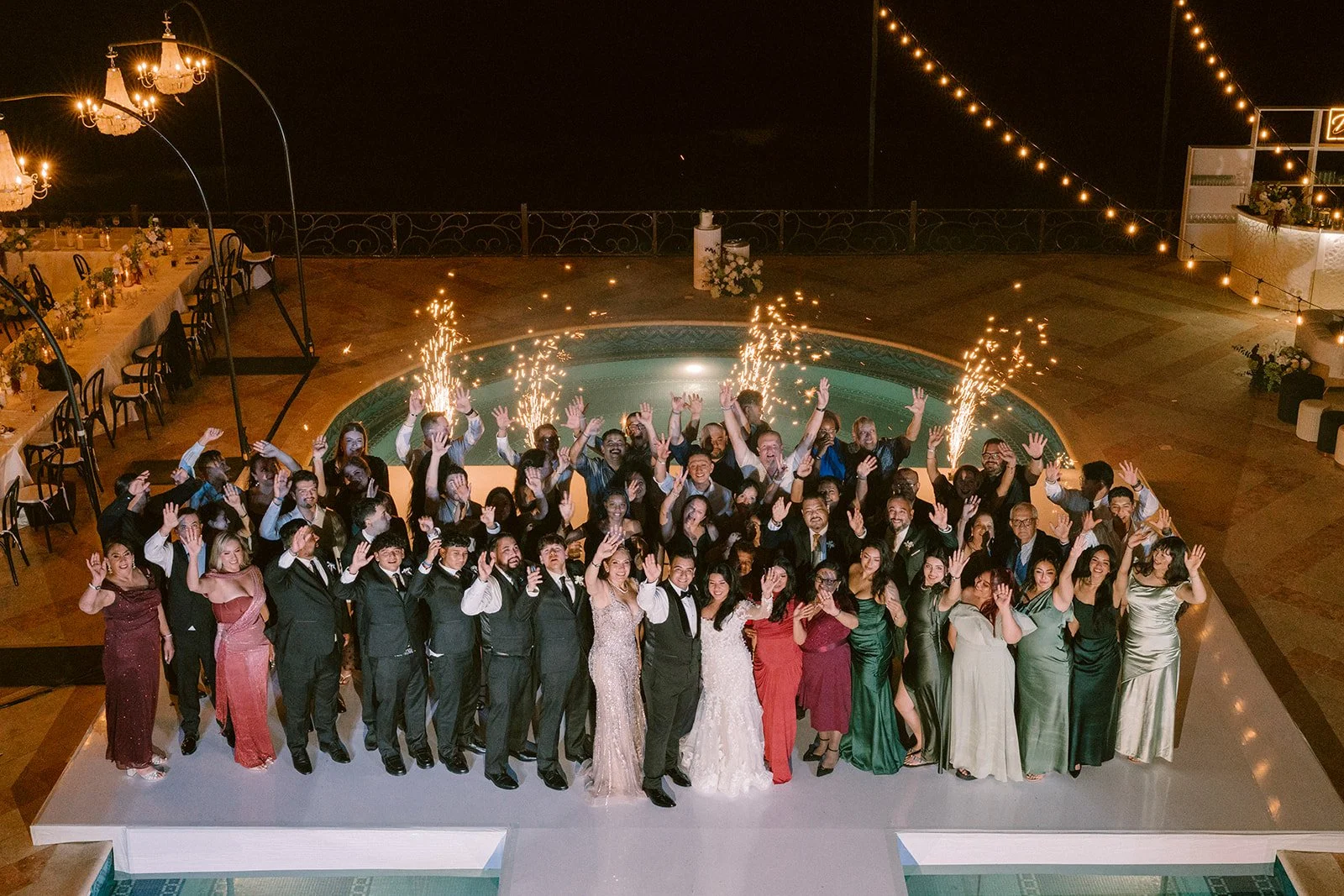 As night fell, string lights illuminated the reception space, casting a warm glow across the tables and reflecting in the pool.