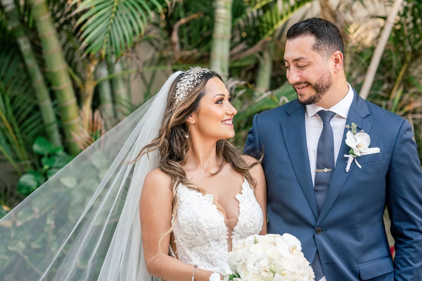 In a gorgeous destination wedding in Mexico Nayeli and Fernando tied the knot surrounded by family and friends and sunshine and love. Bride Nayeli was pretty as a princess with a stunning gown and veil that showed off her natural beauty. Groom Fernando was the tall, dark and handsome prince of her dreams in his fabulous blue suit. The two together just GLOWED, wait until you see all the photos of this destination wedding in Mexico that will make you oooh and aah!