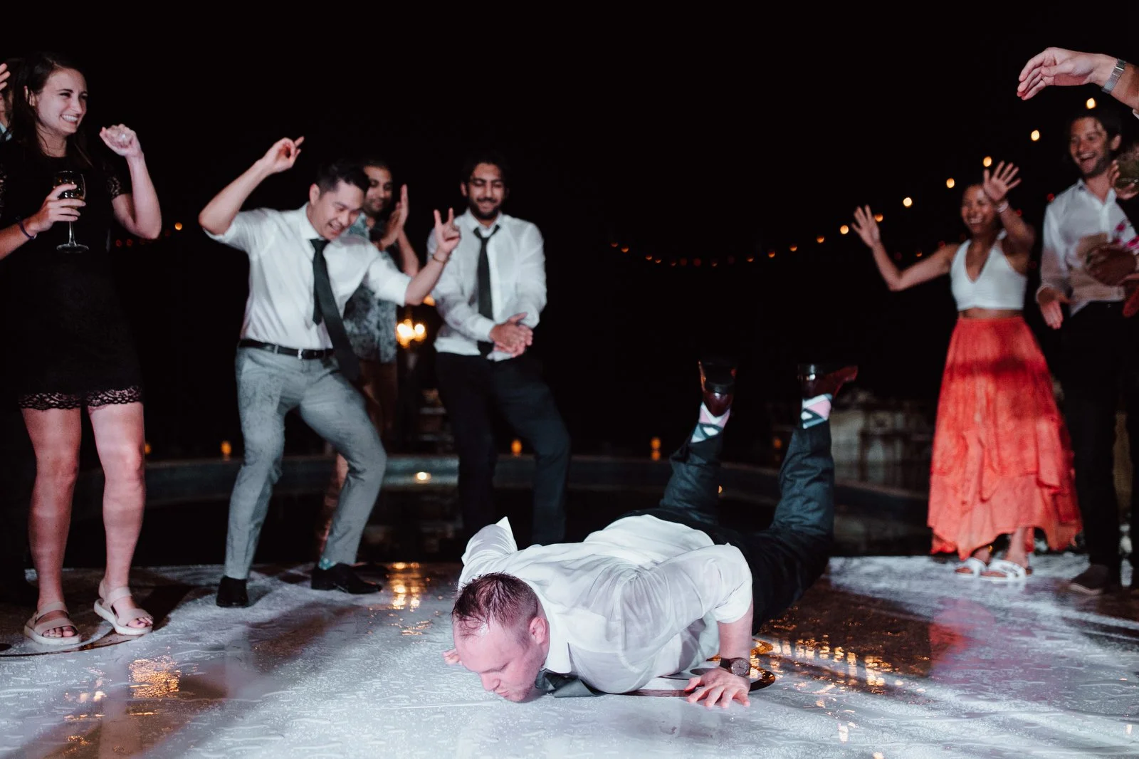 With toasts and laughs and a delicious dinner catered by Gourmet Soberanis, the Riviera Maya wedding reception of Jasmin and Steven was a great party! The cake with beautiful cascading sugar roses was out of this world, an incredible creation by Pasteleria La Migaja. DJ Uno Audio had everyone on the dance floor, grooving to the tunes and we even saw a little breakdancing!