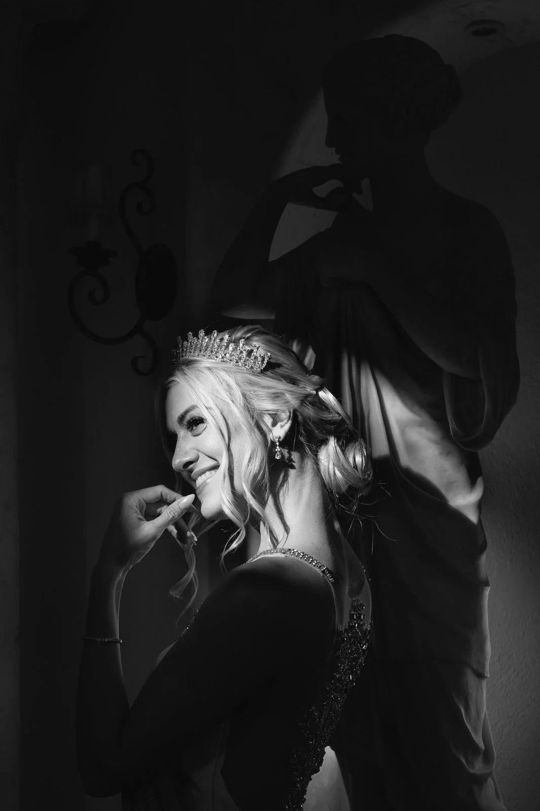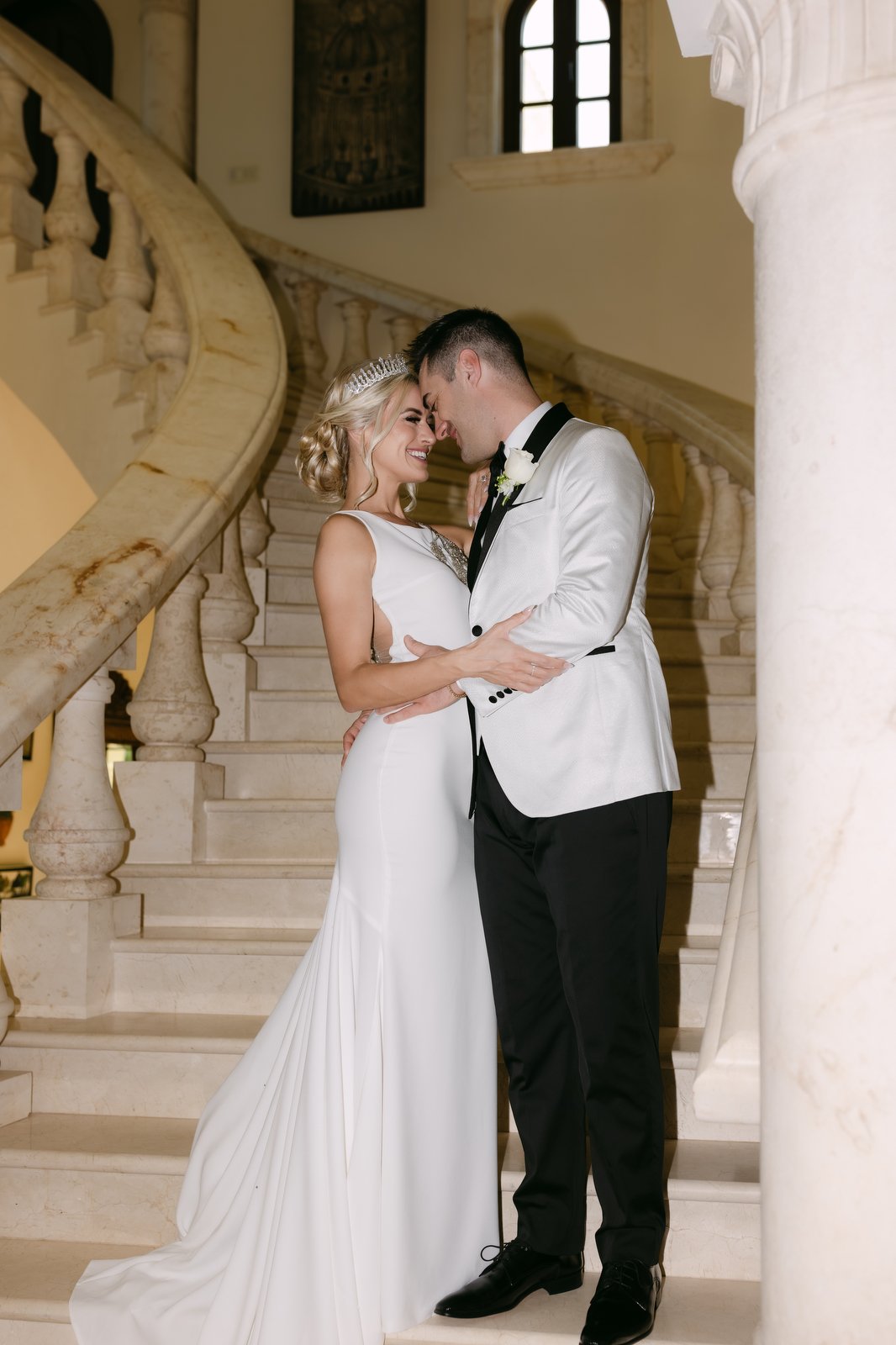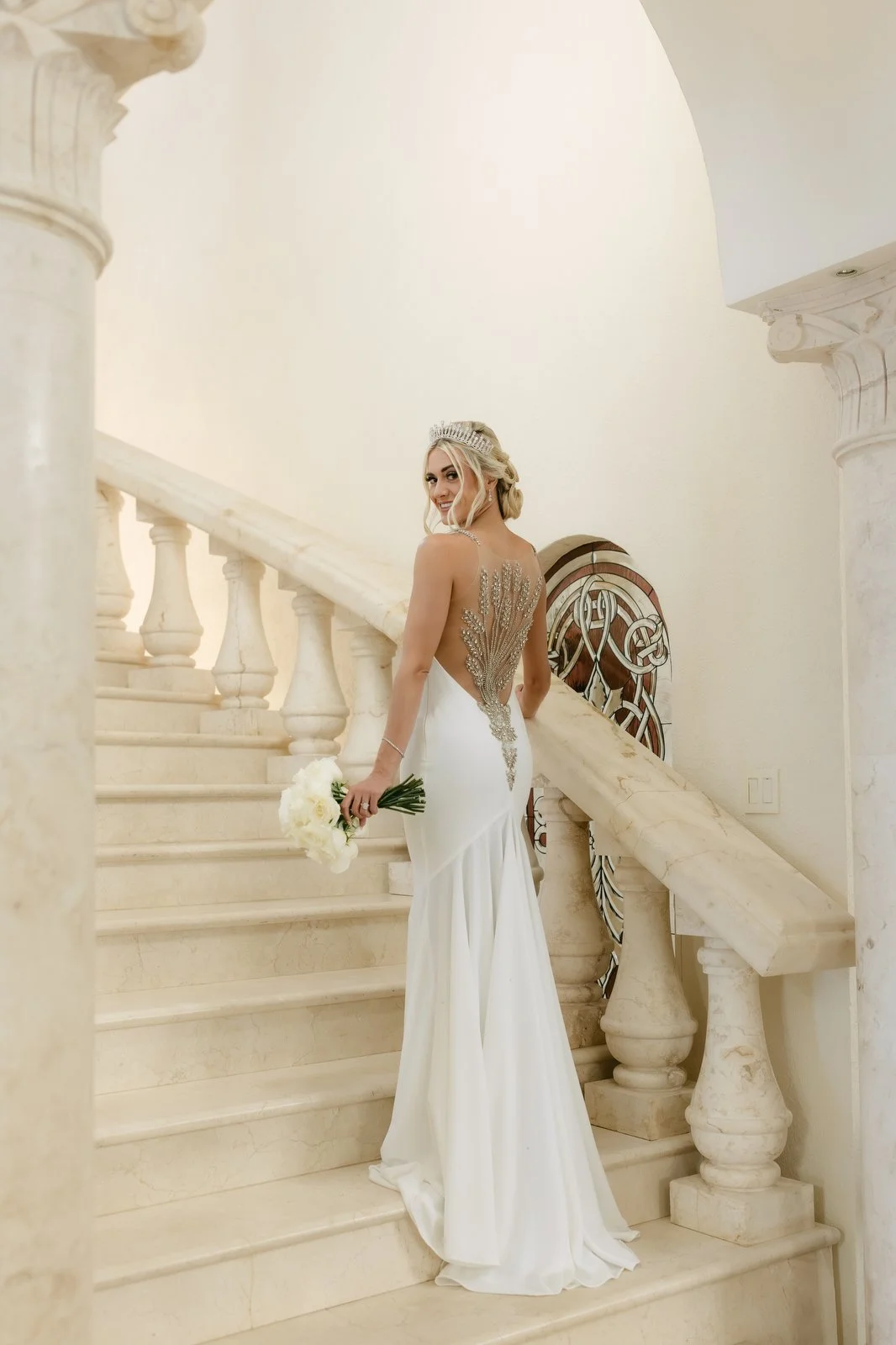 Her Dovita gown felt sculptural and refined from every angle. Crystal embellishment cascading down the open back caught the ocean light beautifully, while her crown subtly nodded to her pageant legacy without overpowering the modern silhouette.