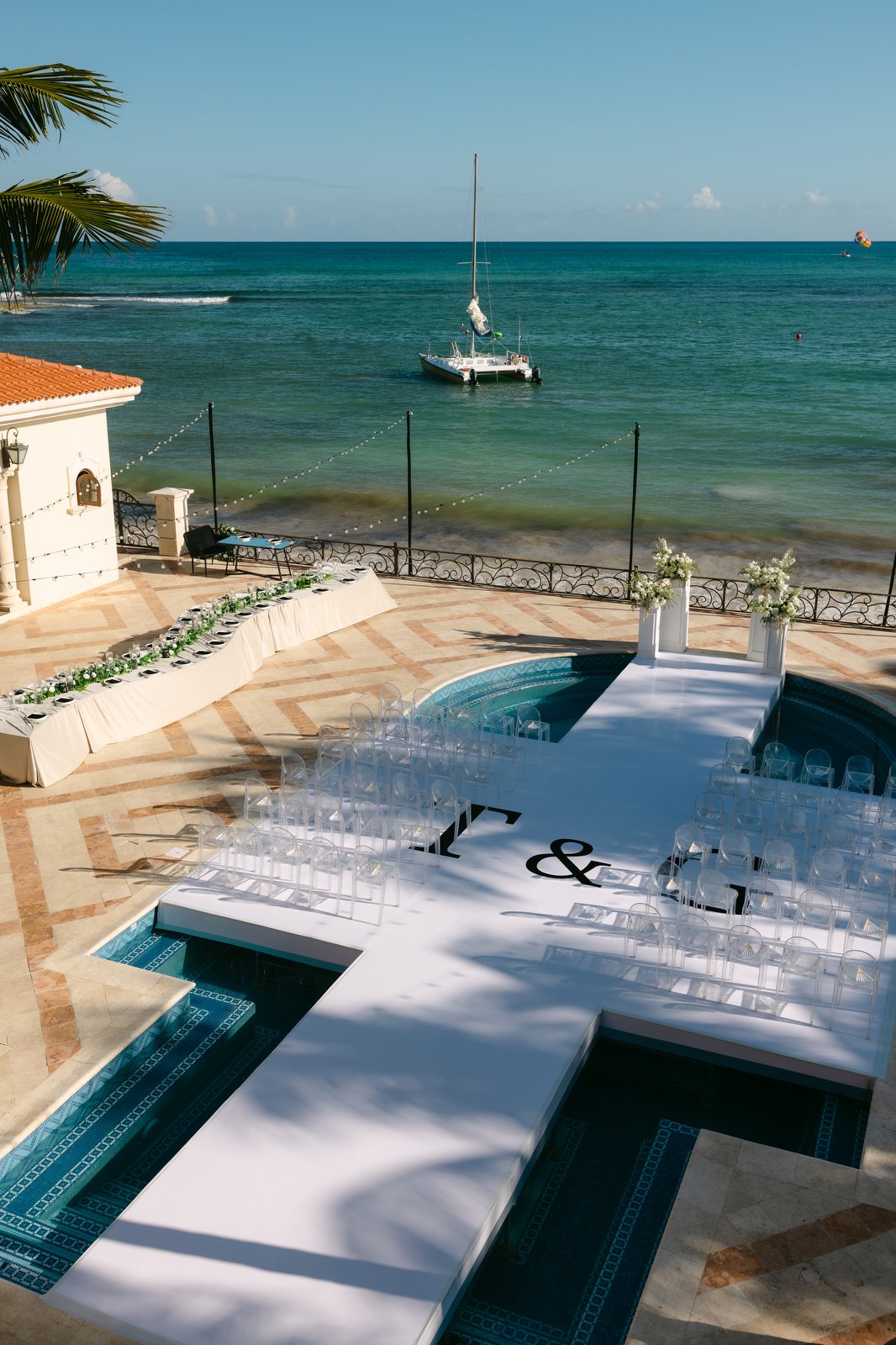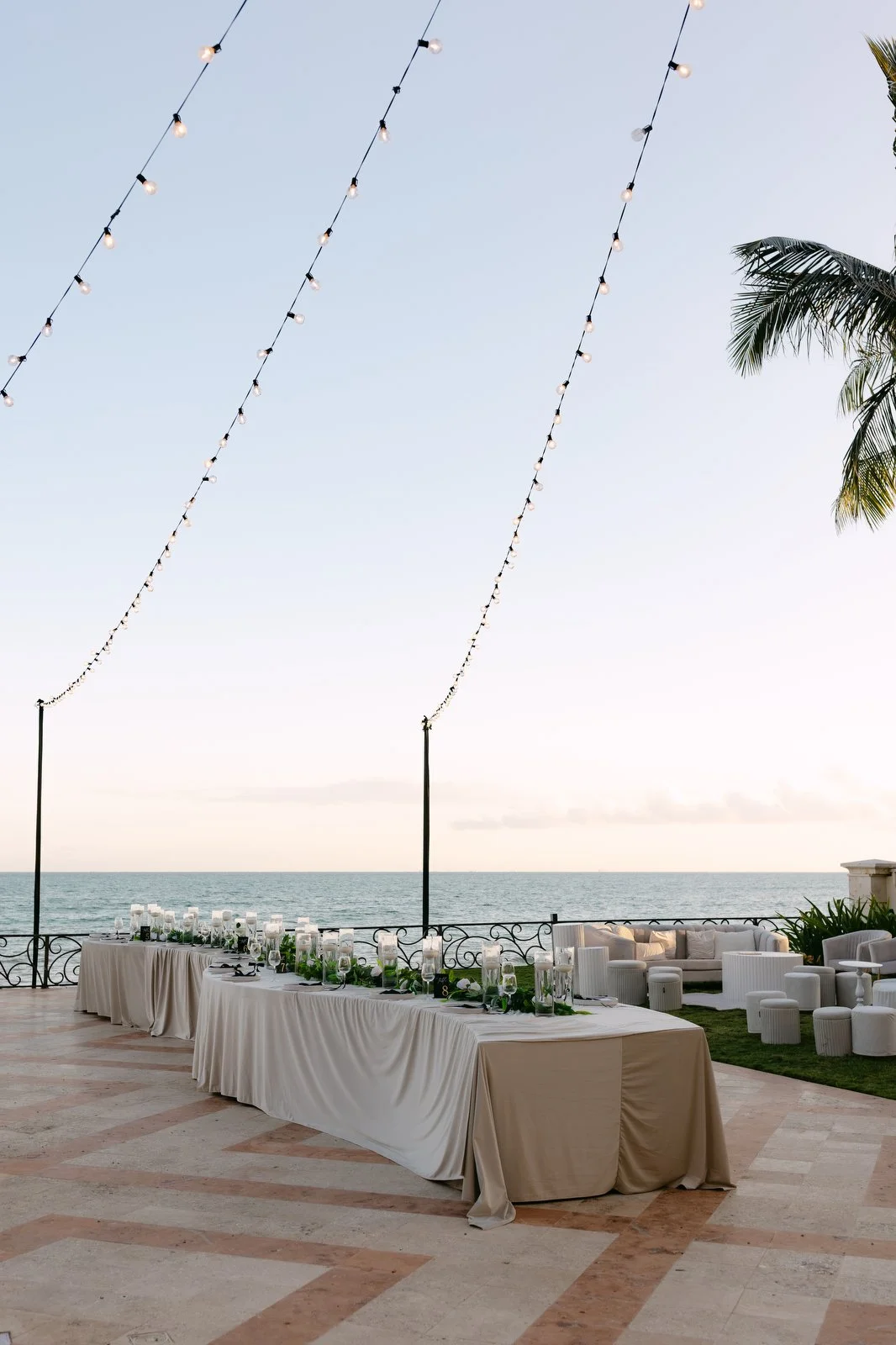 Setting: Oceanfront ceremony over the pool, terrace reception under string lights