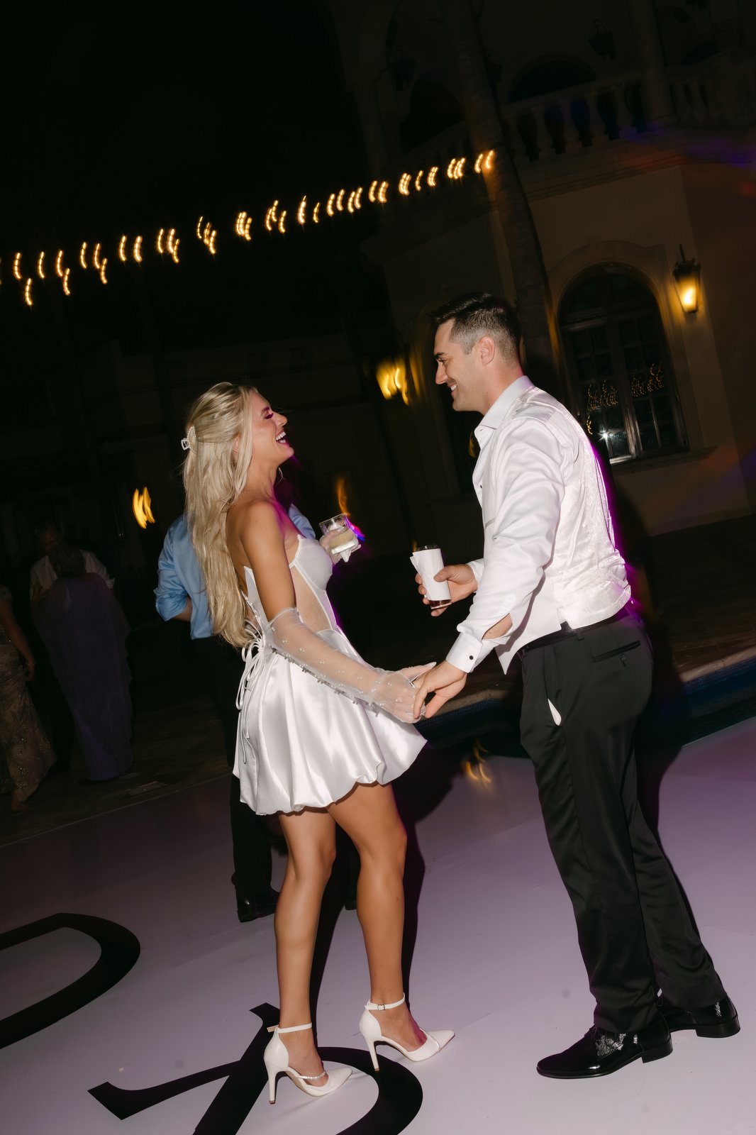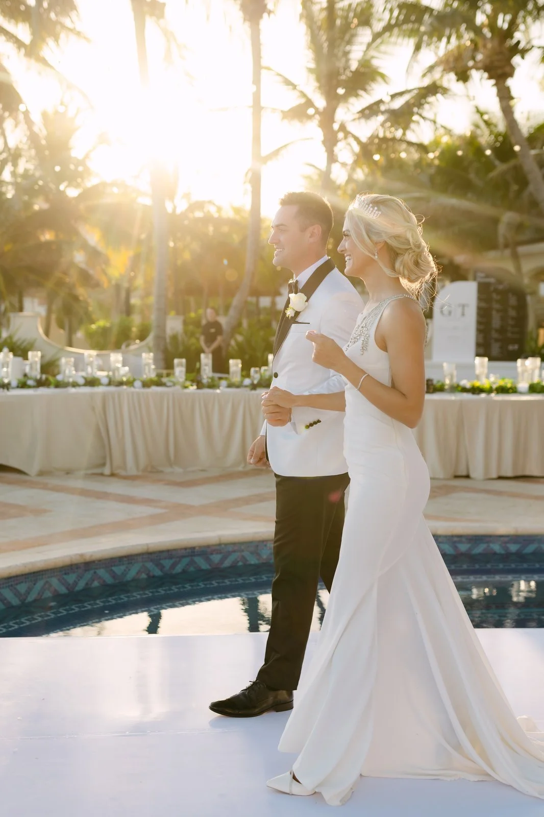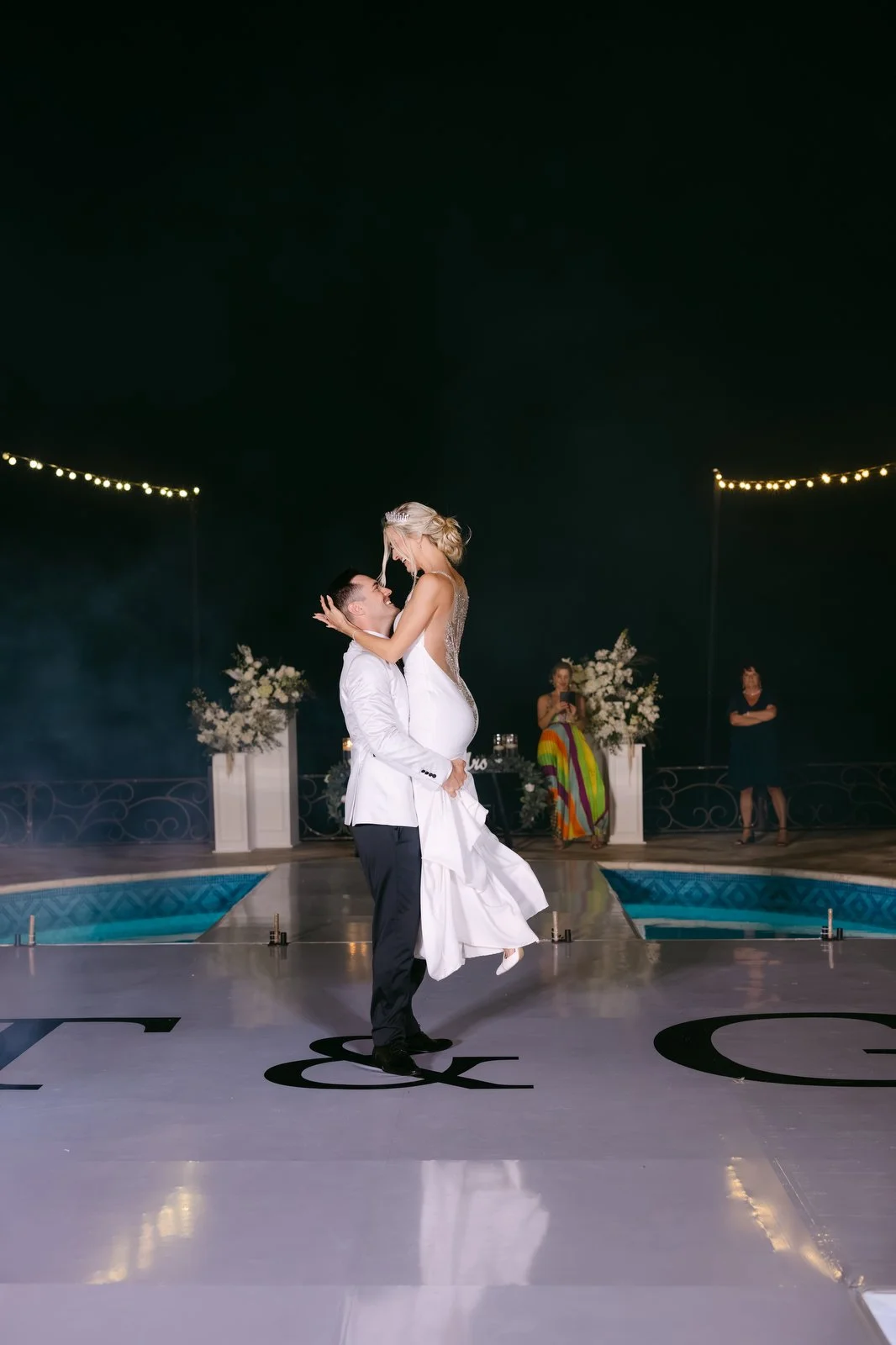 Yes. Couples can install a personalized dance floor over the pool, including monograms, specialty lighting, and production elements such as dry fireworks.