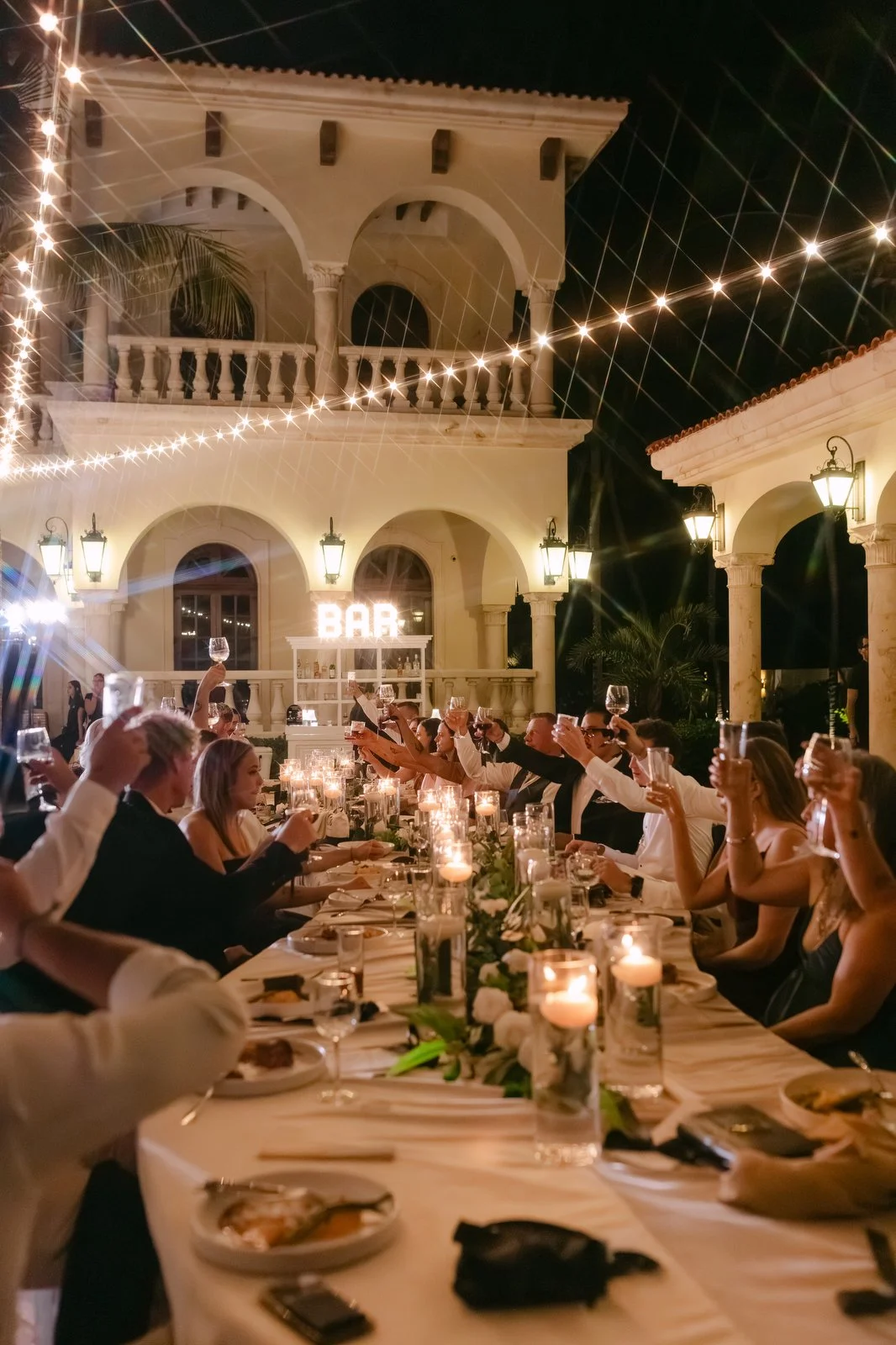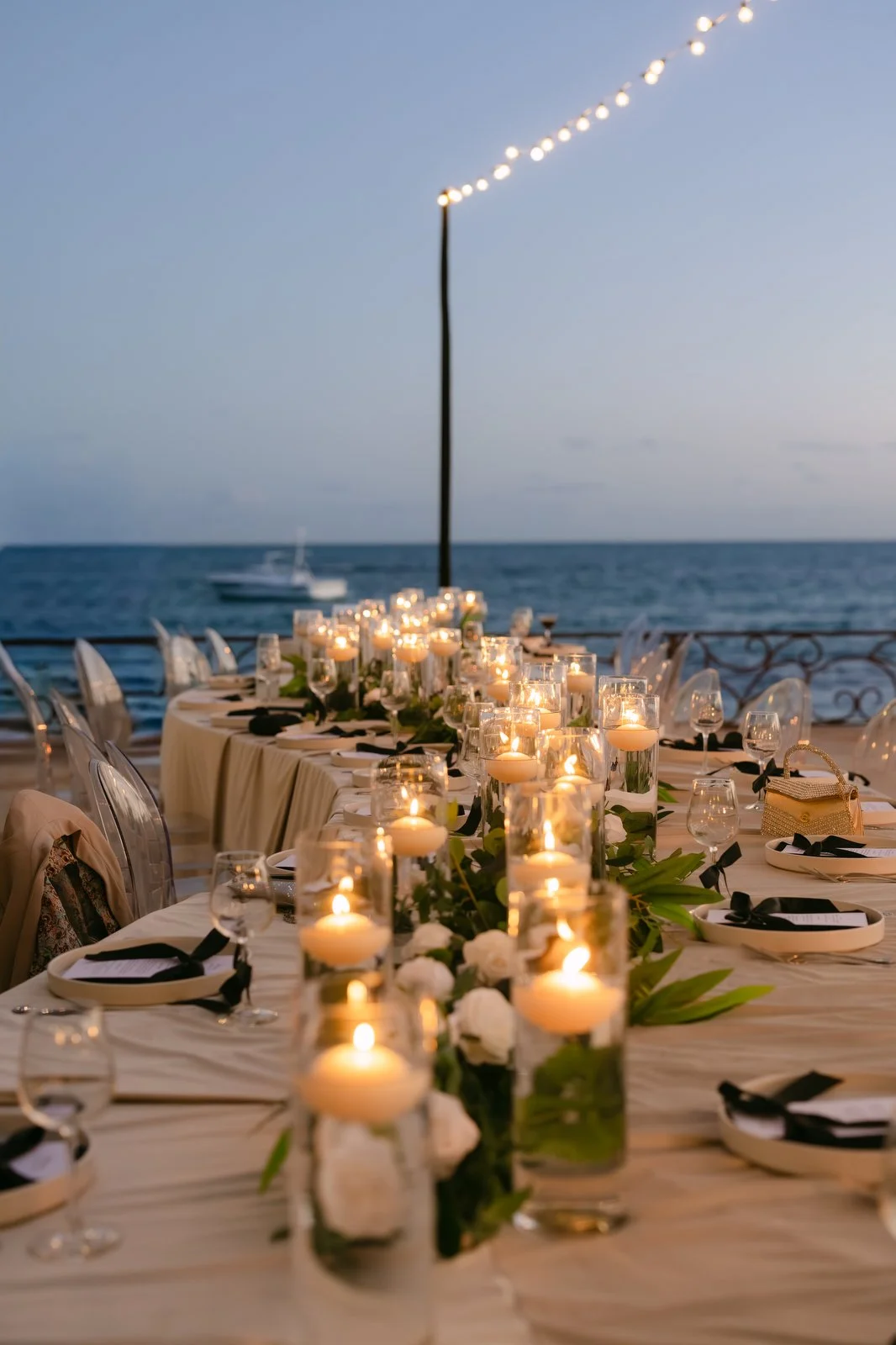 Serpentine reception tables lined the terrace overlooking the ocean. White roses and soft greenery sat low between rows of glowing candles, allowing conversation to flow while the sea and sky framed the evening. Black accents added contrast and structure without overpowering the setting.
