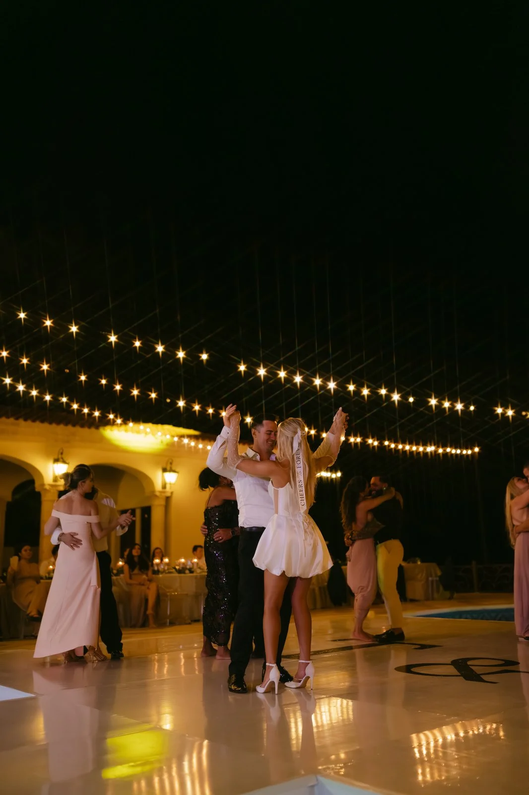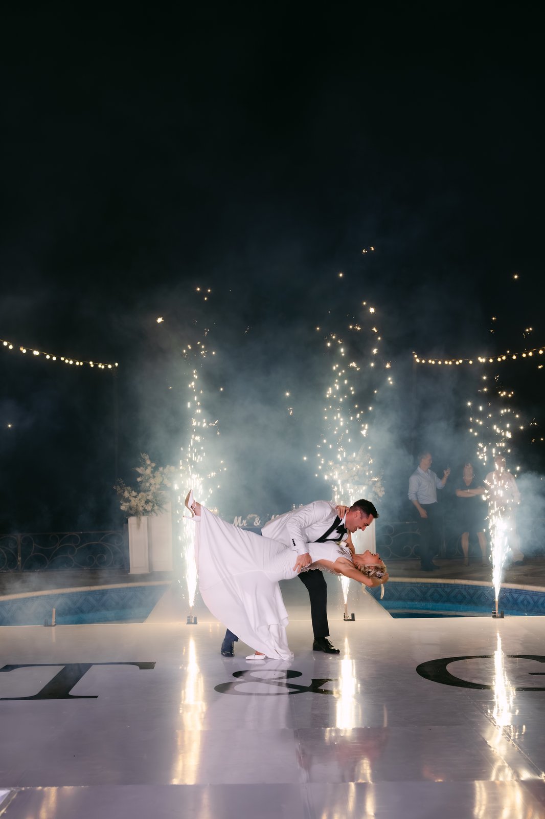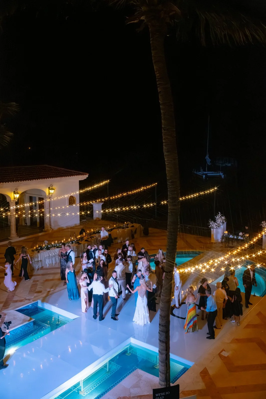 As night fell, the terrace transformed. A custom monogrammed dance floor extended over the pool, illuminated by string lights and dramatic dry fireworks.