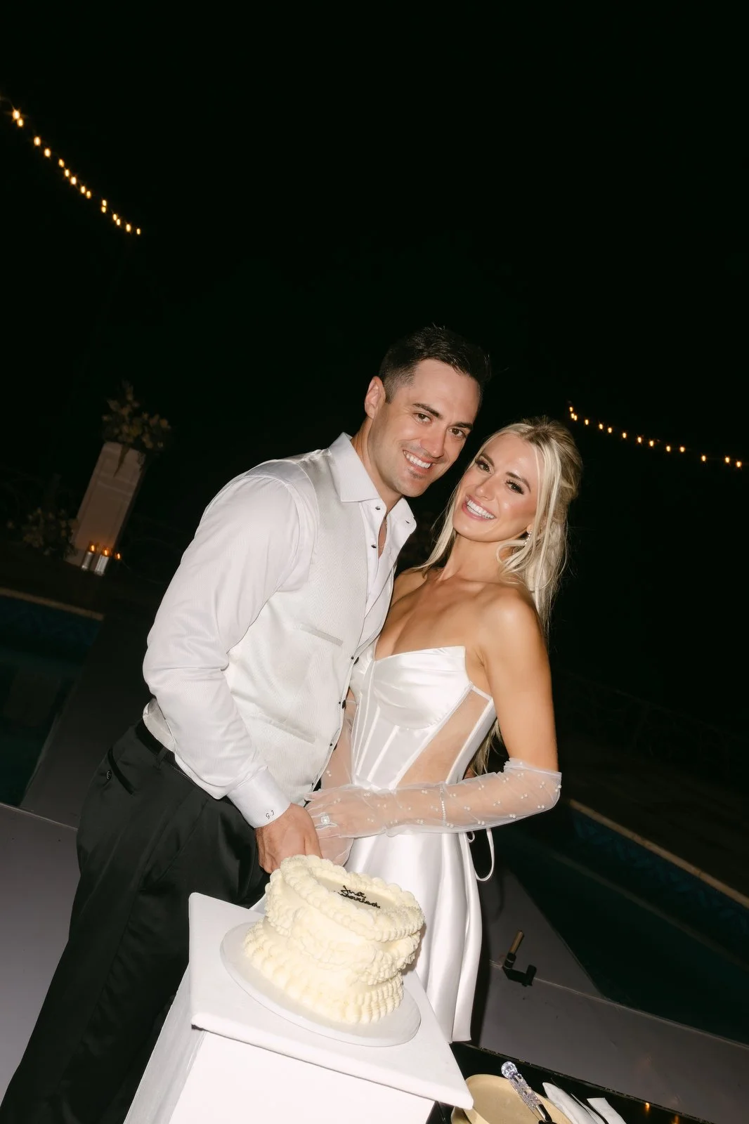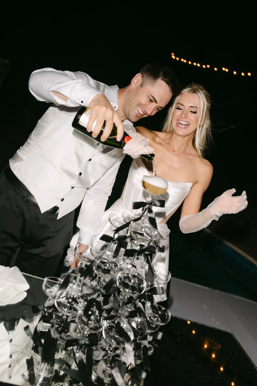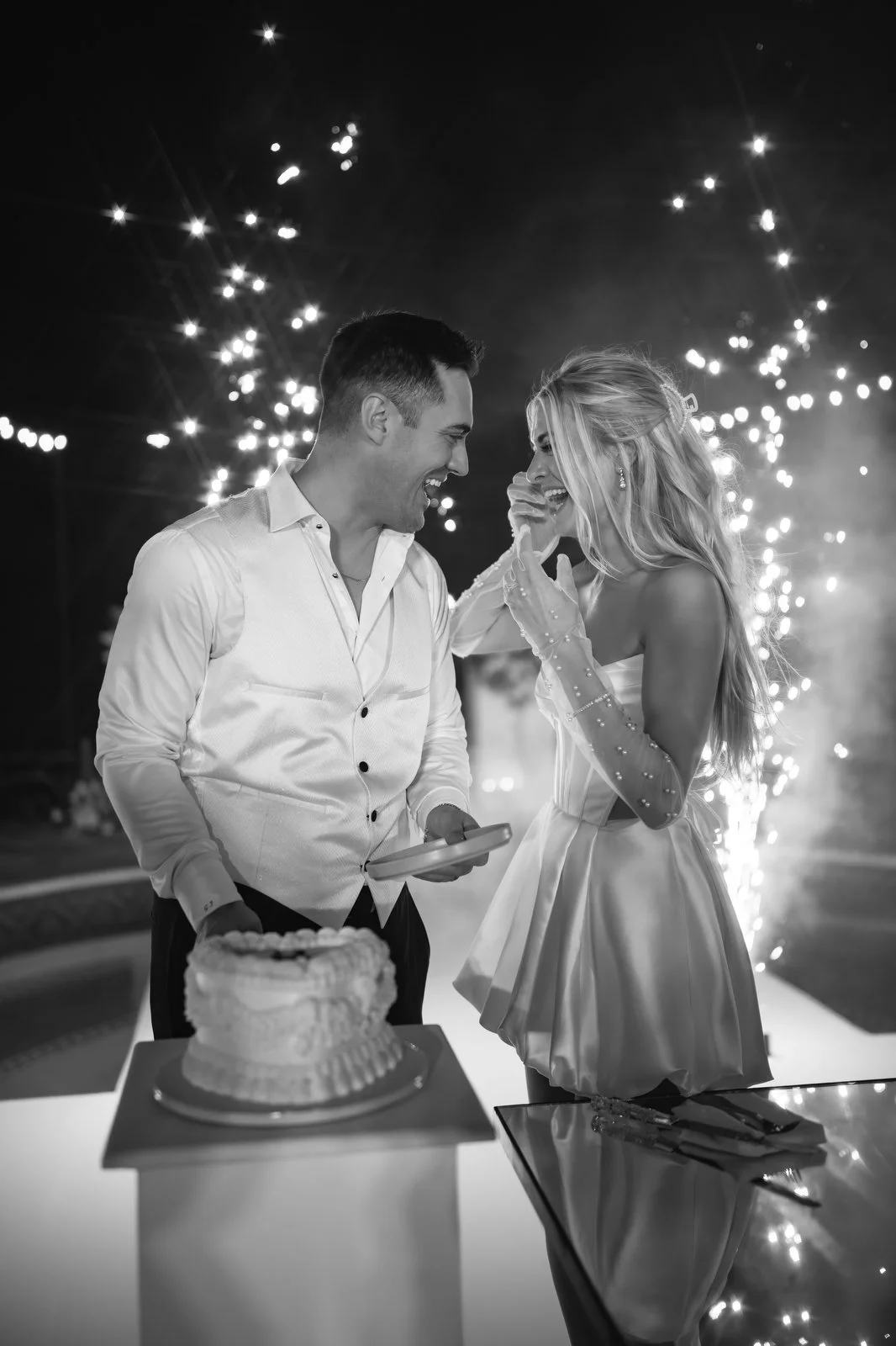 As night fell, the terrace transformed. A custom monogrammed dance floor extended over the pool, illuminated by string lights and dramatic dry fireworks.
