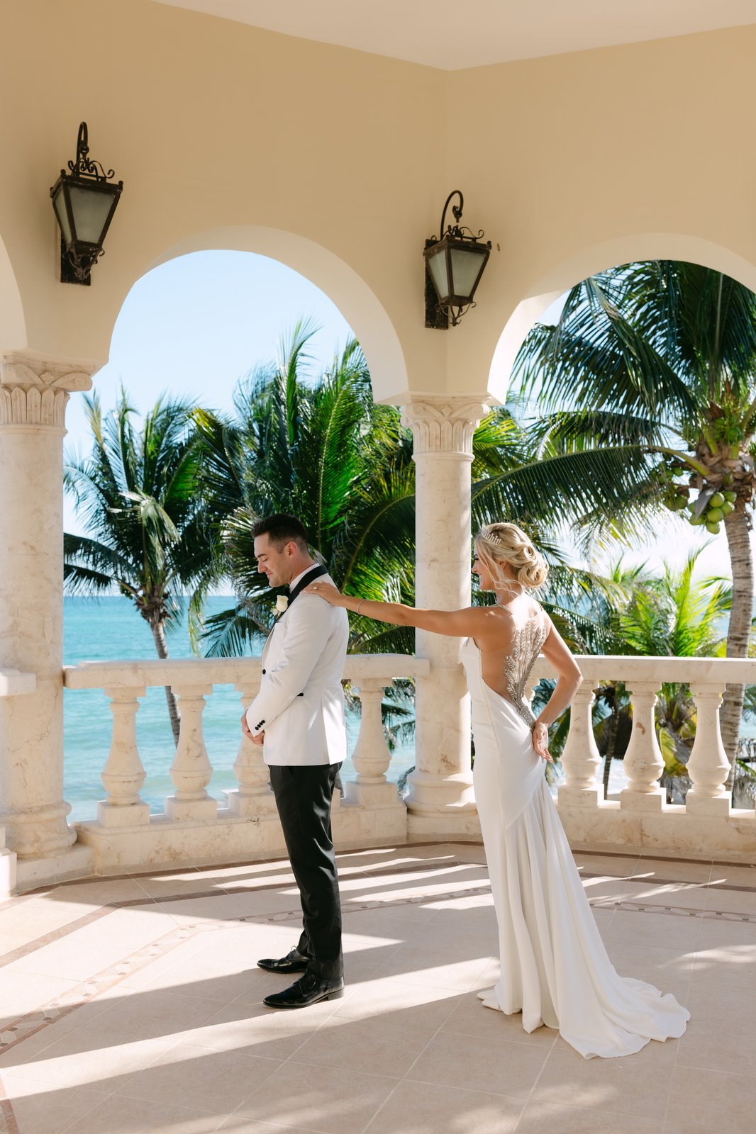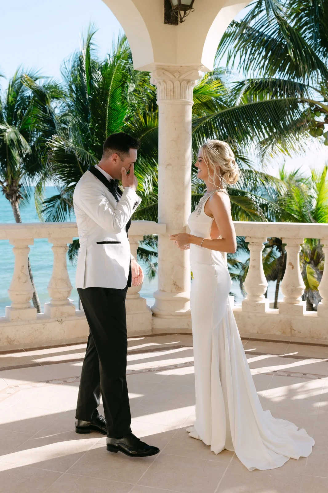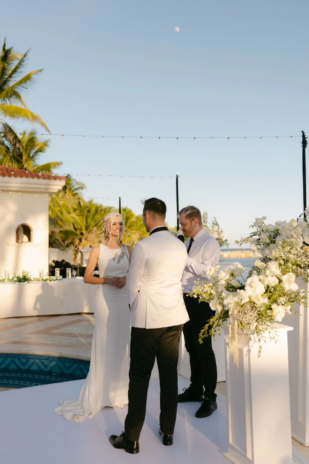 They exchanged vows on Villa la Joya’s signature over-the-pool ceremony platform, the Caribbean Sea stretching endlessly behind them. Framed by soft white florals and open sky, the setting felt expansive yet deeply intimate.