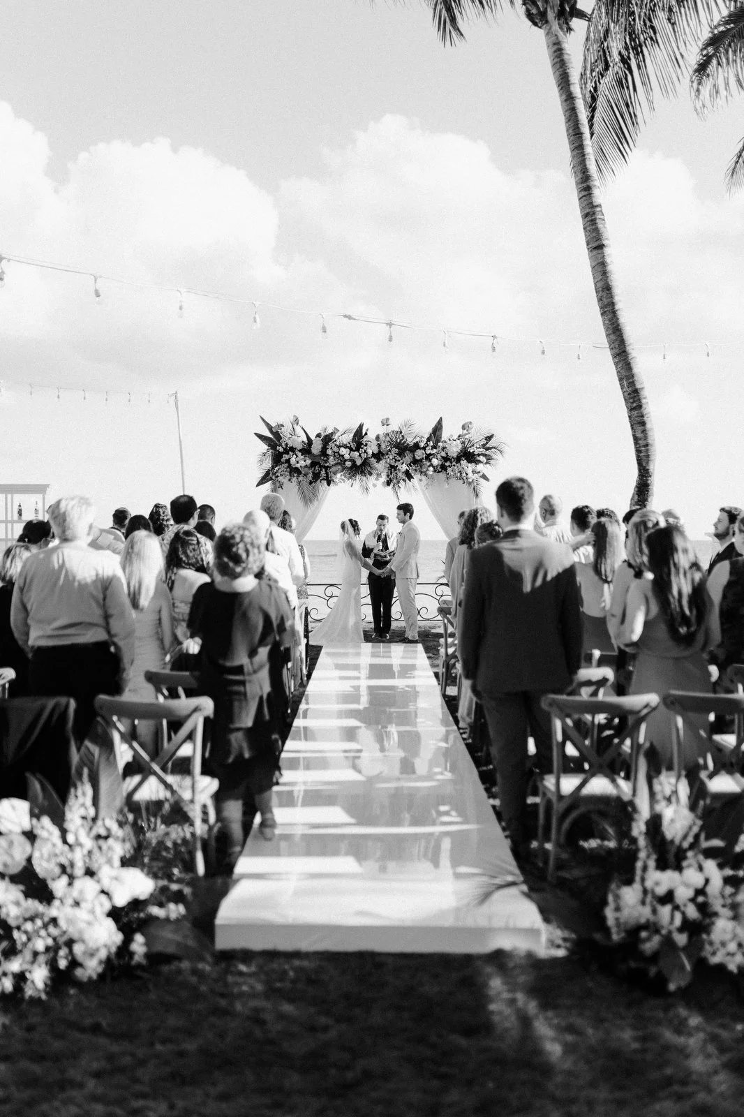 For Riley and Joey, that meant a ceremony that felt open and calm, with the ocean as a constant backdrop. The design followed that same approach, tropical, elegant, and refined. White florals, soft greenery, and natural wood tones framed the space without competing with it.