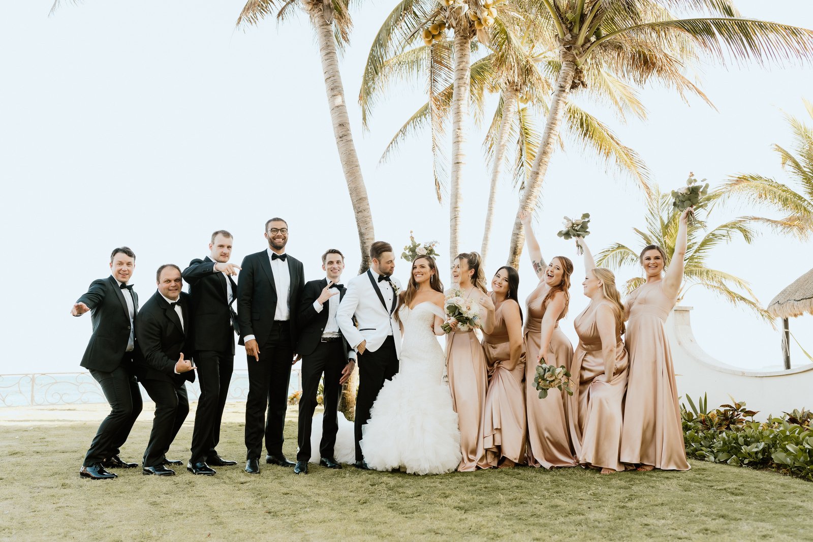 Laura and Kevin celebrated their love and life together with a romantic wedding ceremony on the main entry stairs of Villa la Joya Playa del Carmen. We ADORED Laura’s wedding gown, lacy and flowy and oh my gosh it has pockets. Kevin wore a traditional tux with a blush bow tie, looking sharp next to his gorgeous bride. The circular arch of white roses and pampas grass and Laura’s gorgeous bouquet by Pentaflor were the perfect floral accompaniments. The wedding ceremony was moving, funny and inspiring.